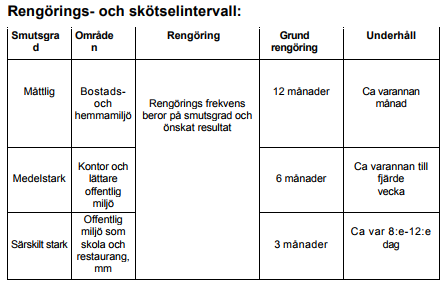 4. De exakta skötsel- och rengöringsintervallen framgår av tabellen under punkt 3 Underhållsrengöring för förseglade trägolv.